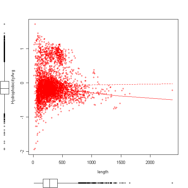 Figure 1 A and B: Length of membrane proteins against hydrophobicity (GRAVY). Figure B shows additionally a linear regression line (solid) and a local polynomial loess fitting (dotted line). The generic correlation tests shows a Pearson coefficient of -0.69 with a p-value of 2.8E-54. The blue scatter plot was done with the default R plot method, the red plot uses the car-scatterplot R library.